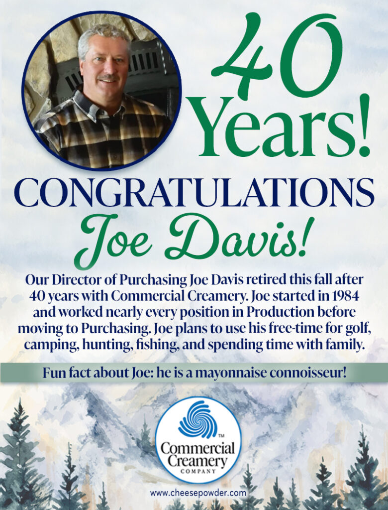 Our Director of Purchasing Joe Davis retired this fall after 40 years with Commercial Creamery. Joe started in 1984 and worked nearly every position in Production before moving to Purchasing. Joe plans to use his free-time for golf, camping, hunting, fishing and spending time with family.